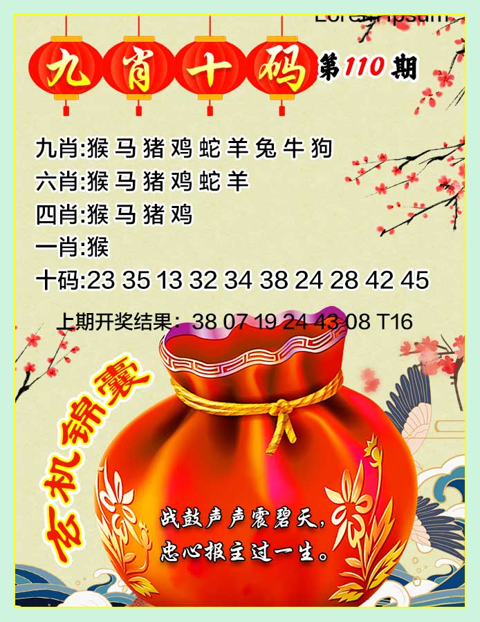 108期㊅肖:【鼠鸡马狗猴猪】~平均押 108期㊂肖:【鼠鸡马】~~稳准狠 108期㊀肖:【鼠】~重点投注 108期➉码:【19 43 10 46 01 49 09 33 23 35】 108期➄码:【19 43 10 46 01】~资料已确定 108期➂码:【19 43 10】~多少买点.包您赚钱! 牢记住澳门彩经网100995.COM